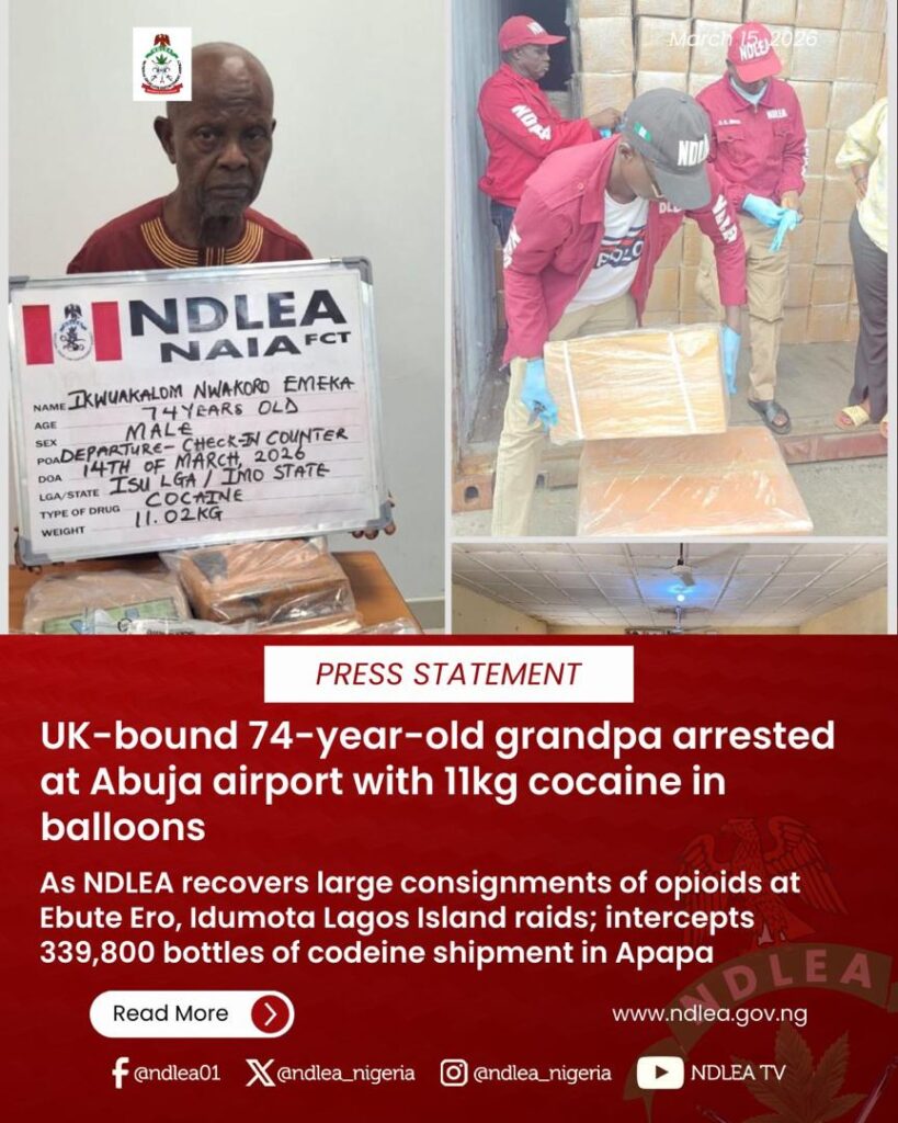 The National Drug Law Enforcement Agency (NDLEA) on Sunday said its operatives have arrested a 74-year-old grandpa, Ikwuakalom Nwakoro Emeka, over possession of illicit substances believed to be cocaine.
