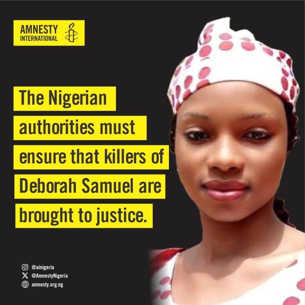 Amnesty wrote, “Deborah Samuel was lynched by her school mates over alleged blasphemy on 12 May 2022 in #Sokoto. More than a year after, the Nigerian authorities have failed to hold her killers to account: