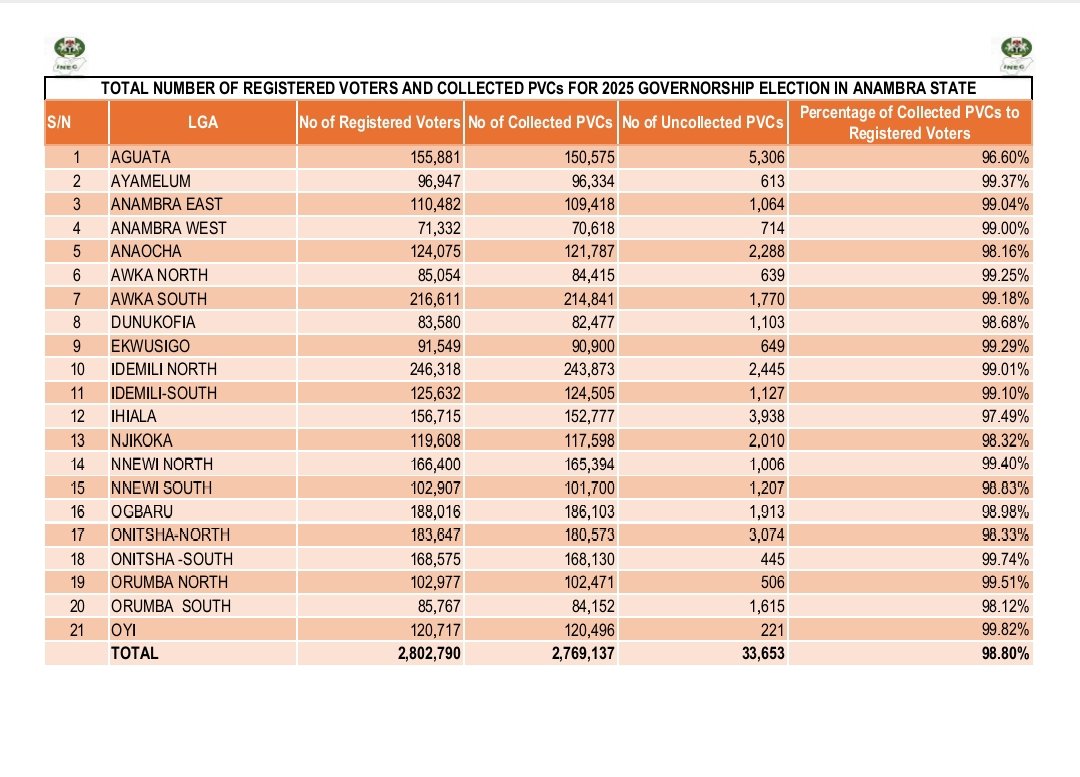 The Independent National Electoral Commission (INEC) has released the full list of total registered voters across the 21 local government areas across Anambra state ahead of the governorship election.