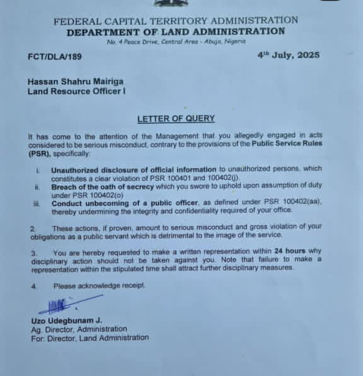 Hassan Mairiga, a Land Resource Officer, has been queried by the Federal Capital Territory Administration (FCTA) over exposure of alleged land fraud by the FCT Minister, Nyesom Wike.