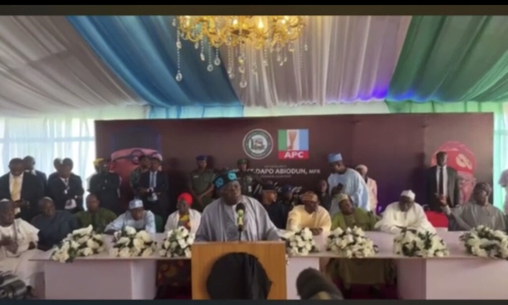 Tinubu, who was speaking in Abeokuta, Ogun State capital on Thursday as part of his round up visitations to delegates, looked back at where the Governor was seated and told the governor and the audience, “That one sitting there, behind me, Dapo, he could not have been Governor if not for me.”