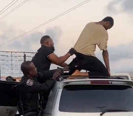 A mild drama has on Thursday occurred along a busy Lagos road as a middle-aged man climbed the roof of a car to evade arrest by operatives attached to the state Police Command Tactical Team.