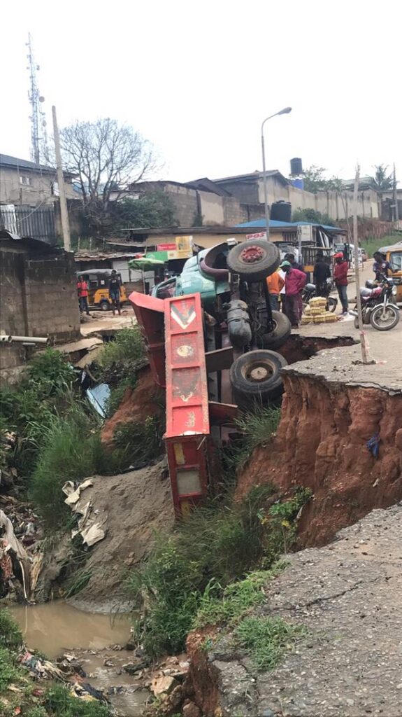A truck has fallen inside an open gully at the Obawole, Iju area of Ogba Lagos State on Wednesday.