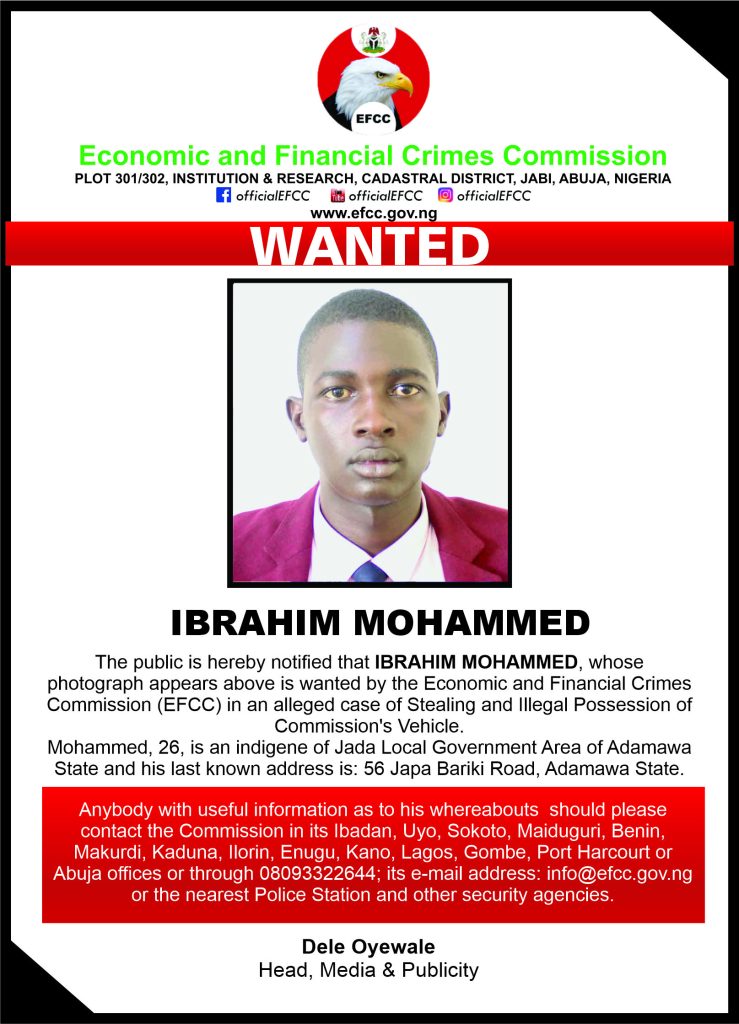 The Economic and Financial Crimes Commission (EFCC) has declared 26 year-old man, Ibrahim Mohammed, wanted for alleged theft of the Commission’s operational vehicle.
