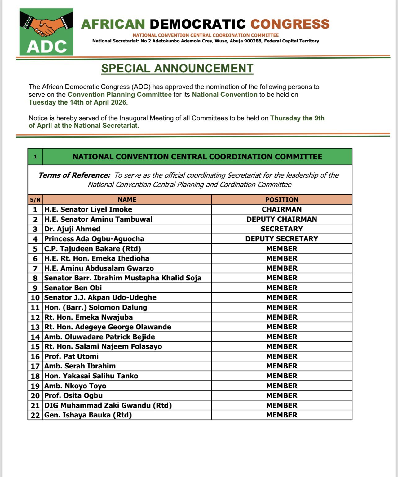 With the ADC affirming its stance on holding the convention despite the de-recognition of its leadership by the Independent National Electoral Commission (INEC), the released the 22-man committee for the convention slated to hold on the 14th of April.