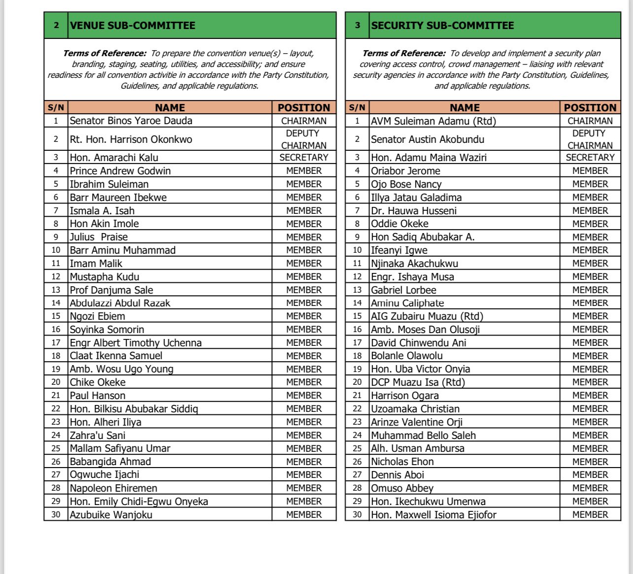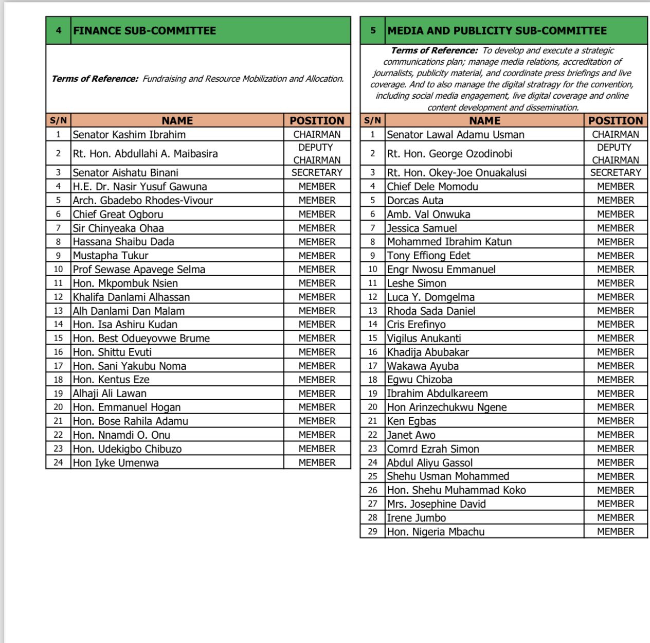 Members of the committee include Aminu Gwarzo, Prof. Pat Utomi, Emeka Ihedioha, and Serah Ibrahim.