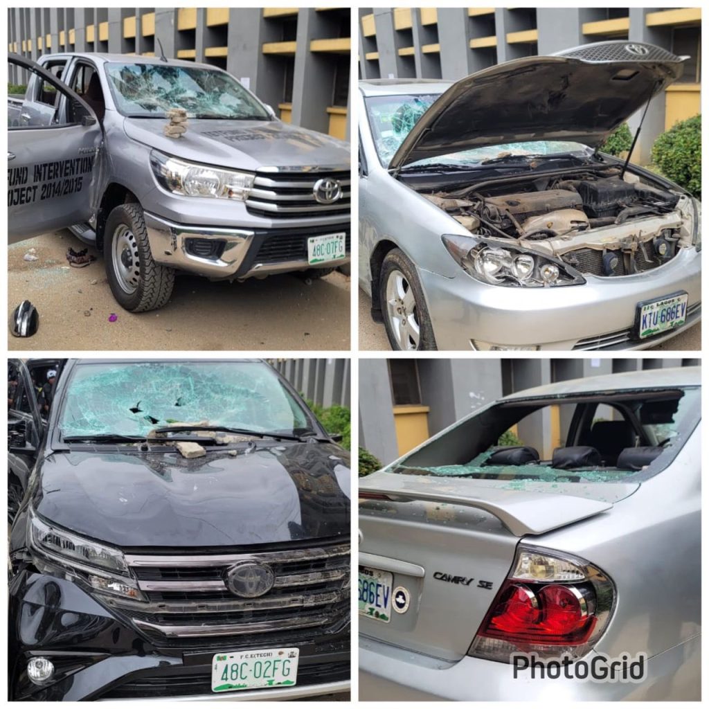 No fewer than five vehicles were vandalised in the attack which was also aided by some students.