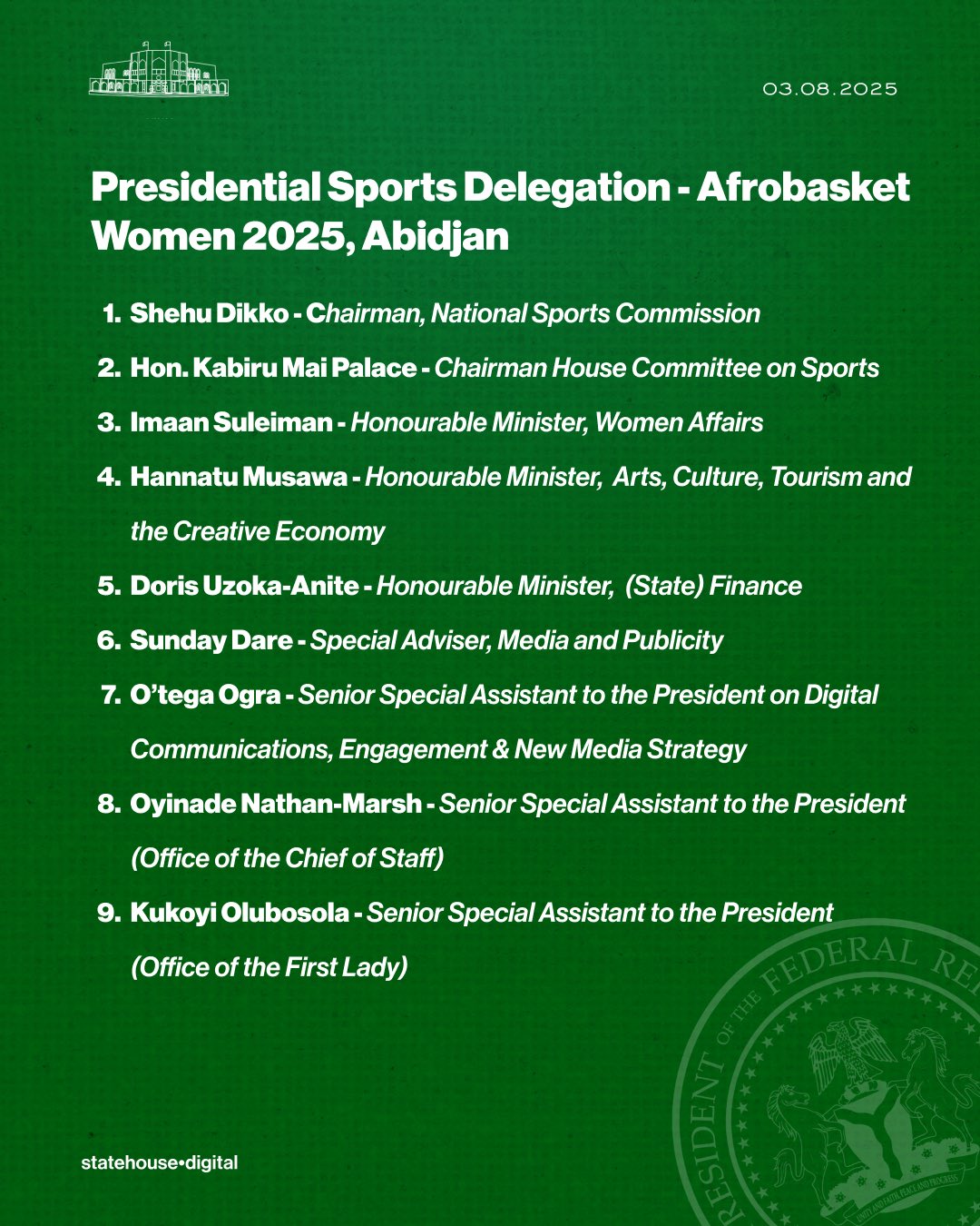 President Bola Tinubu has sent a nine-man delegate to Abidjan, capital city of Cote D’Ivoire, ahead of the 2025 FIBA Women’s Afrobasket final between the Nigeria’s female basketball team, D’Tigress, and Mali.