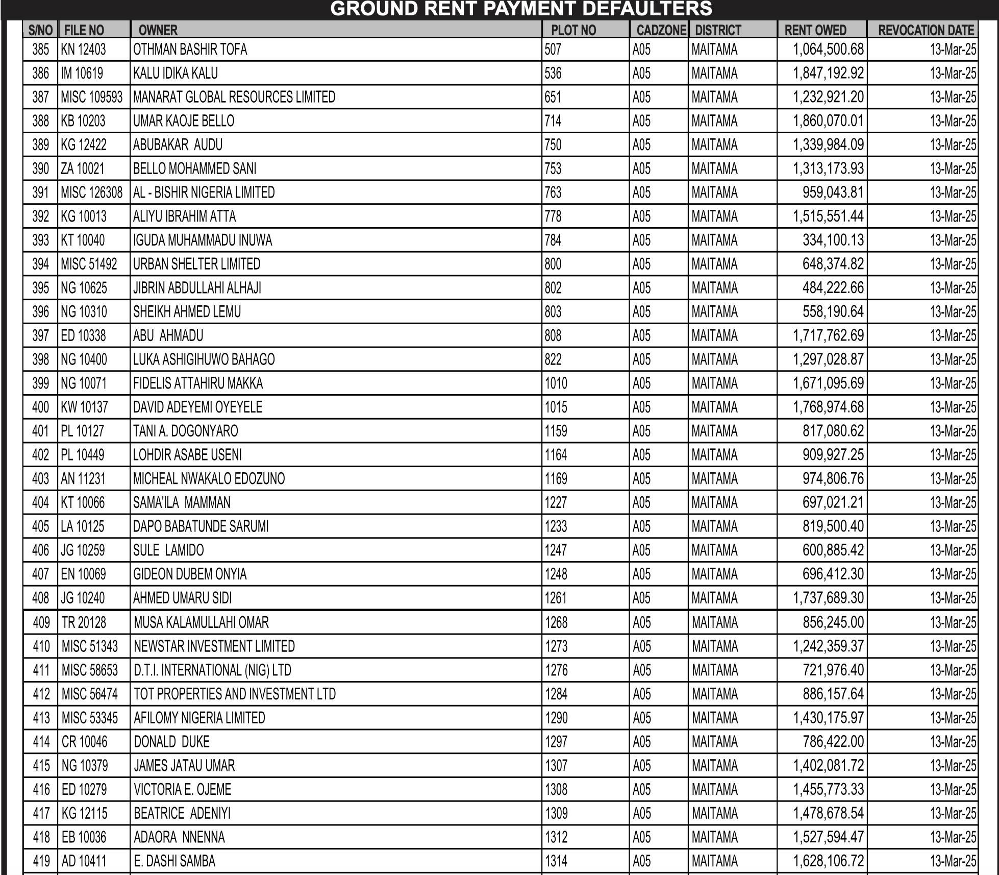 As revealed in some of the pages of the list shared on X, Ganduje allegedly owe N2 million ground rent on one of his now revoked properties located in Wuse 2, Abuja.