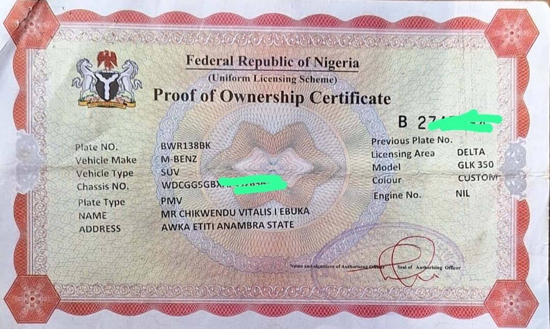 Attached to the post were pictures of the dented vehicle as well as a Proof of Ownership Certificate which bears Chukwuebuka’s name.