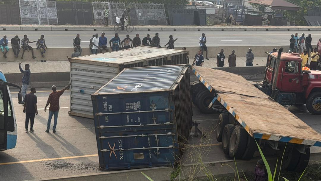 Thousands of commuters have been left stranded along the Otedola Bridge section of the Lagos-Ibadan expressway after a container-laden trailer overturned in the early hours of Wednesday.