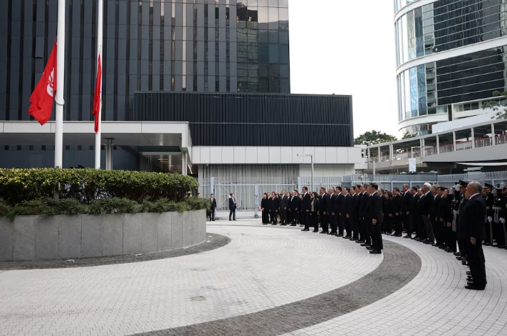 Hong Kong leader John Lee, other officials and civil servants, all dressed in black, stood in silence for three minutes early on Saturday outside the central government offices, where flags were lowered to half-staff.