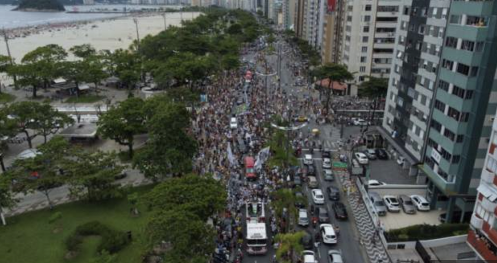 The people of Santos are doing everything they can to catch a glimpse of Pele’s coffin as it passes through the streets. The streets along Santos beachfront are packed as Pele’s funeral procession continues.