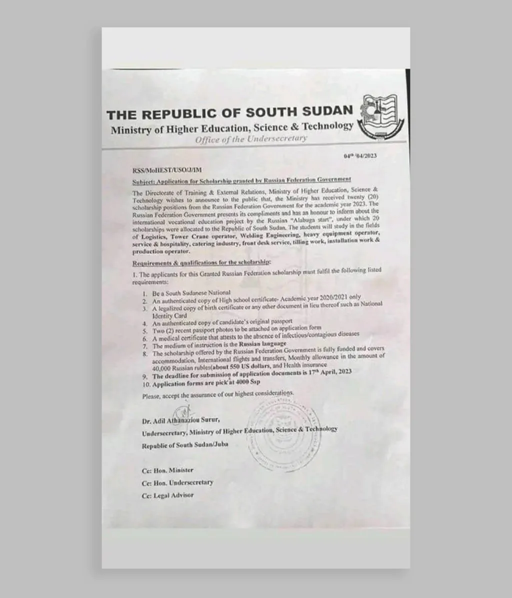 “My friend posted about a scholarship in Russia on their Facebook status. The advert was by the South Sudanese Ministry of Higher Education,” she says.