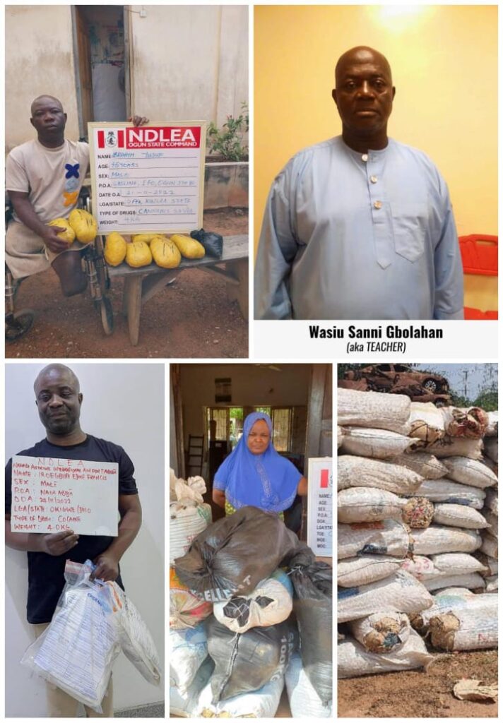 No fewer than 5,851.3 kilograms (5.8 tons) of cannabis sativa were seized from dealers across five states in the past week, including a notorious cripple, Ibrahim Yusuf, 45, who was arrested on Monday 21st Nov. at Gasline, Ifo, Ogun state with 4kg of the psychotropic substance, while a total of 36 bags weighing 570kg of the same substance were recovered in another raid at a forest in Ogunmakin town, Obafemi Owode LGA.