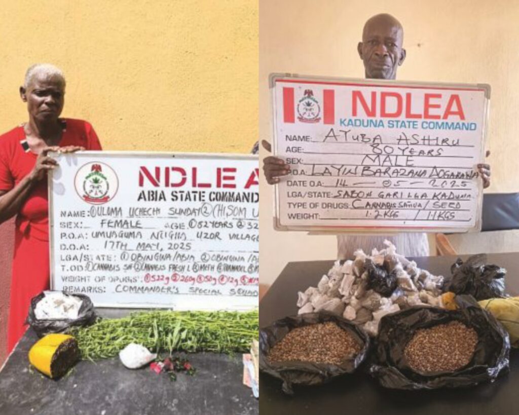 Operatives of the National Drug Law Enforcement Agency (NDLEA) have banned two octogenarians, an 80-year-old grandpa Ayuba Ashiru and 82-year-old grandma Mrs. Uloma Uchechi following recovery of skunk, tramadol, and methamphetamine amongst other illicit drugs found in their possession.