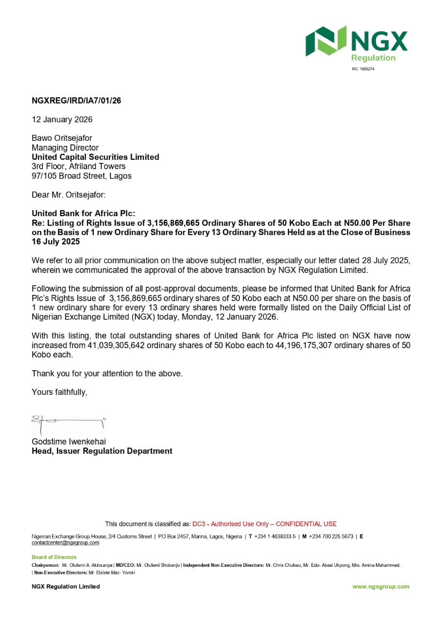 “Following the submission of all post-approval documents, please be informed that United Bank for Africa Plc’s Rights Issue of 3,156,869,665 ordinary shares of 50 Kobo each at N50.00 per share on the basis of one new ordinary share for every 13 ordinary shares held were formally listed on the Daily Official List of Nigerian Exchange Limited (NGX) on , Monday, 12 January 2026”, Iwenkehai stated in the letter.