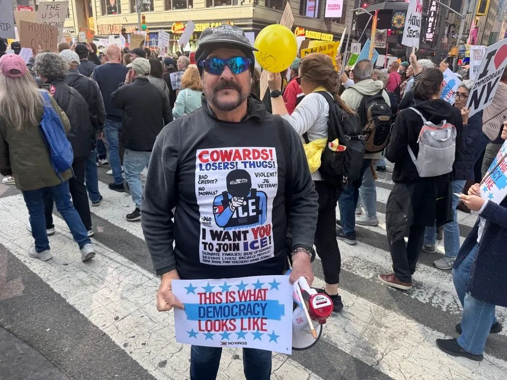 Thousands packed New York City’s iconic Times Square and streets all around, with people holding signs with slogans like “Democracy not Monarchy” and “The Constitution is not optional”.