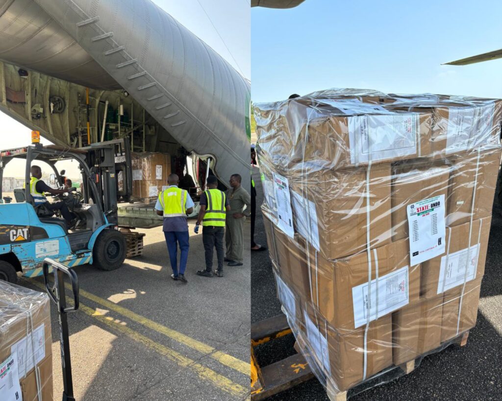 INEC said the materials, conveyed by the Nigerian Air Force, were received by the officials of the Central Bank of Nigeria following its arrival in Akure, Ondo state’s capital.