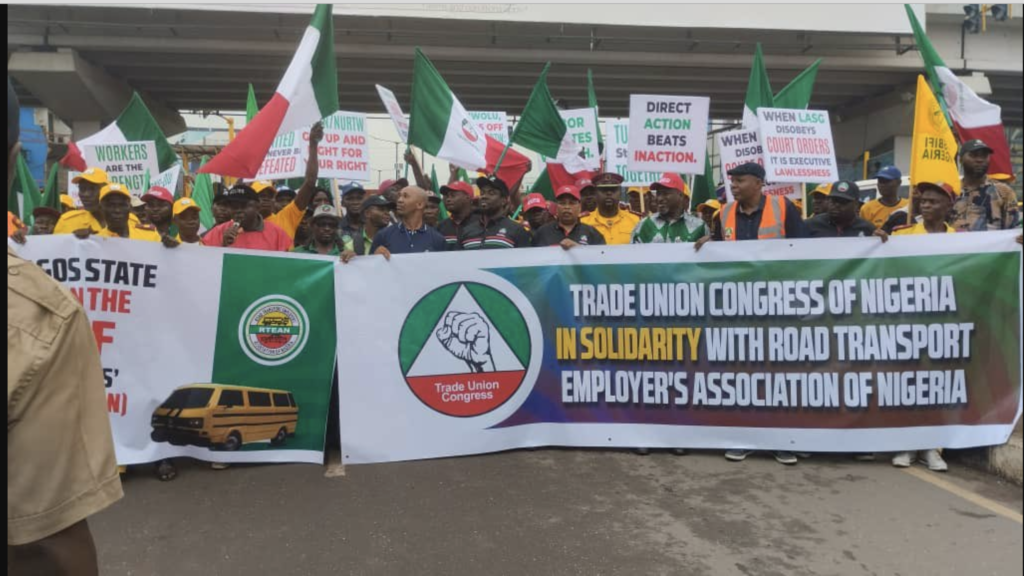 The Trade Union Congress on Monday made good its vow to stage a protest against the decision of the Lagos state government not to obey the order of the National Industrial Court to unban the Road Transport Employers Association of Nigeria, RTEAN, from the state parks and garages.