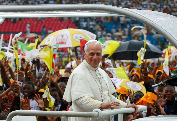 The first U.S. pope closed the nearly 18,000 km (11,185 miles) tour with a final Mass in a stadium in Equatorial Guinea, where tens of thousands began gathering in pouring rain before dawn for a last chance to see him.