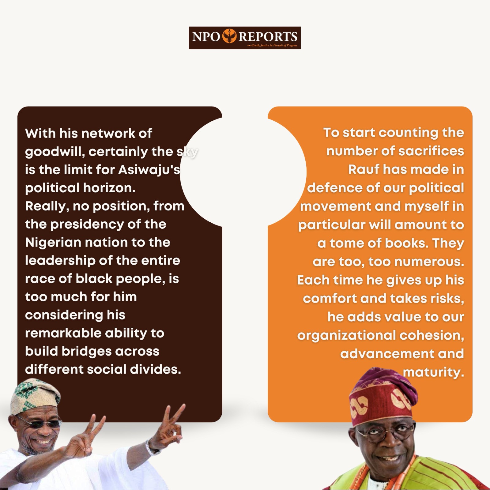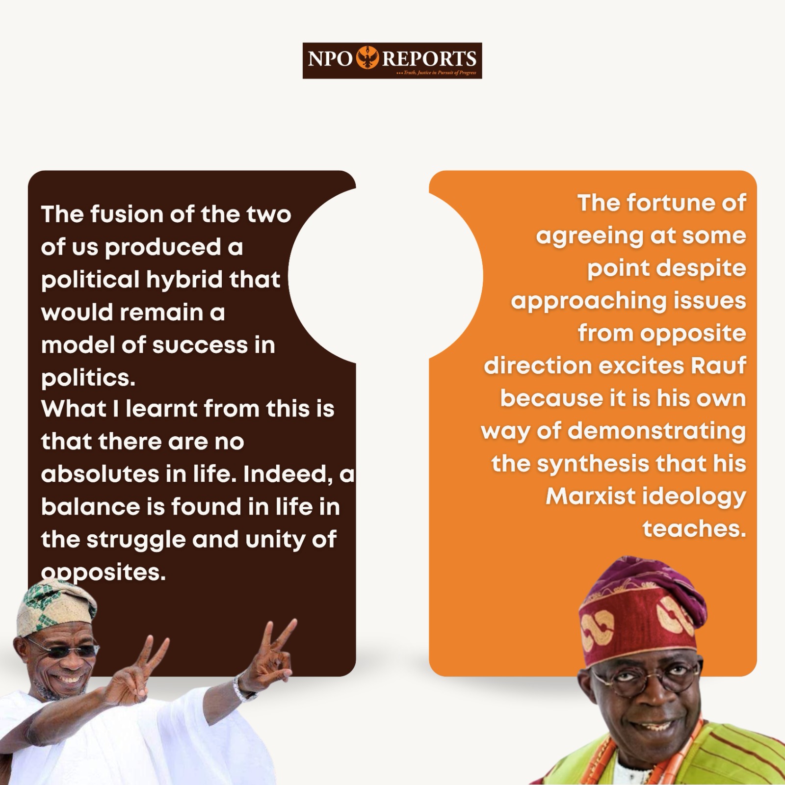 Tinubu didn’t stop here. He went ahead in the same tribute to add that “It is significant to note that we joined forces at a time of mutual need. Rauf and his colleagues had mobilized a group of young reformers whose mission was to change the content of politics in Alimosho area. They had identified the elderly men with progressive inclination such as Baba Orelope and turned themselves to their foot soldiers. But their effort to convert their new-found grassroots followership to political power floundered because of material limitations.”
