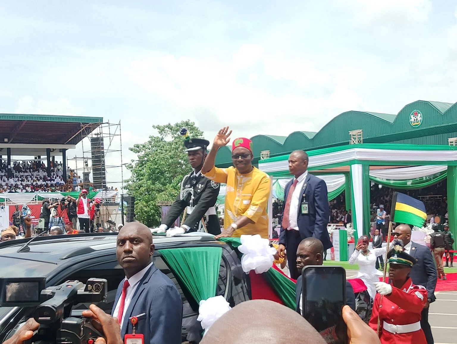 He arrived Ekwueme Square, with Vice-President Kashim Shettima, former President Olusegun Obasanjo and former President Goodluck Jonathan, to a tumultuous reception.