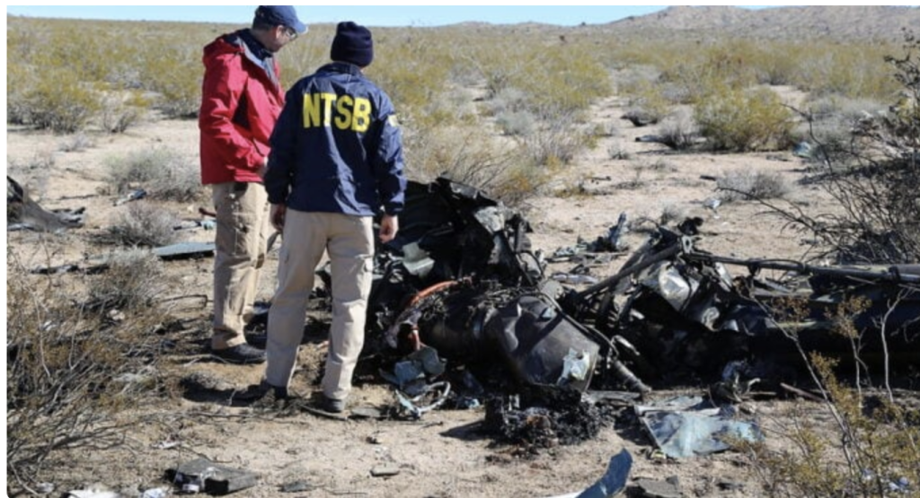 The board said the “wreckage was located in high mountainous desert and scrub brush covered terrain, and debris were scattered about 300 ft along a 120° magnetic heading from the initial impact point”.